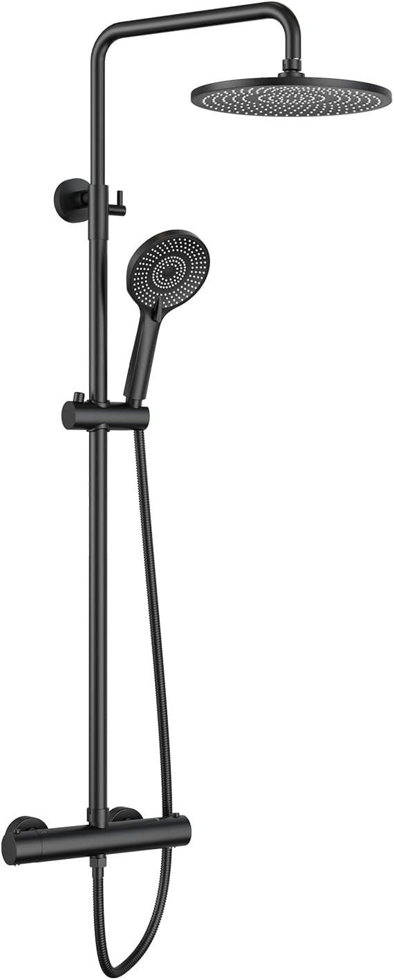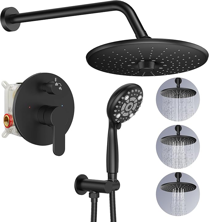 Black Shower System - 10 Inches Rain Shower Head Faucet- 6 Setting Handheld Shower Head Set- Valve Included - Matte Black