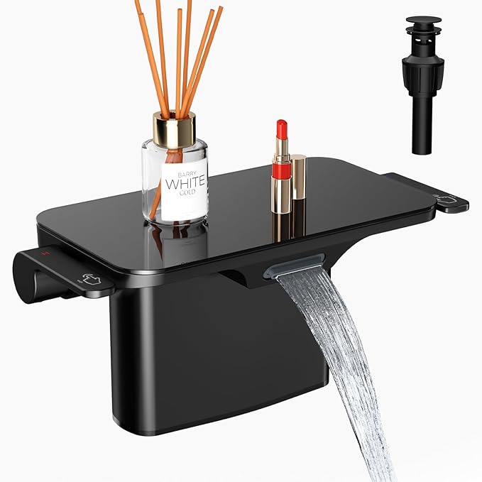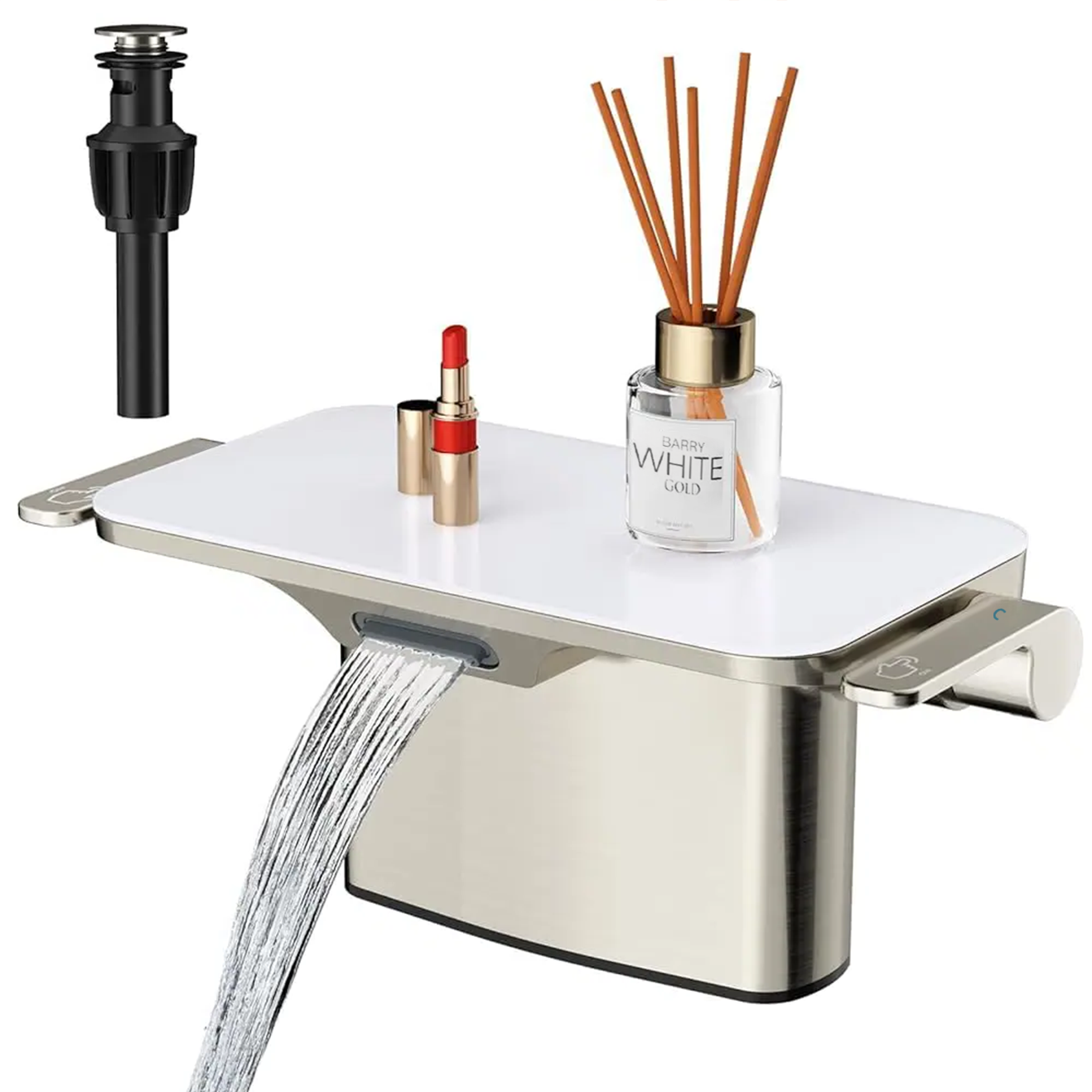 Bathroom faucets with tempered glass panels boost storage, fitting glasses, jewelry, cosmetics, etc., ideal for small bathrooms.